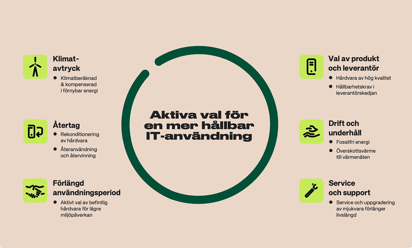 - Använda kvalitativ och miljöcertifierad hårdvara med längre livslängd och lägre miljö- och klimatavtryck.